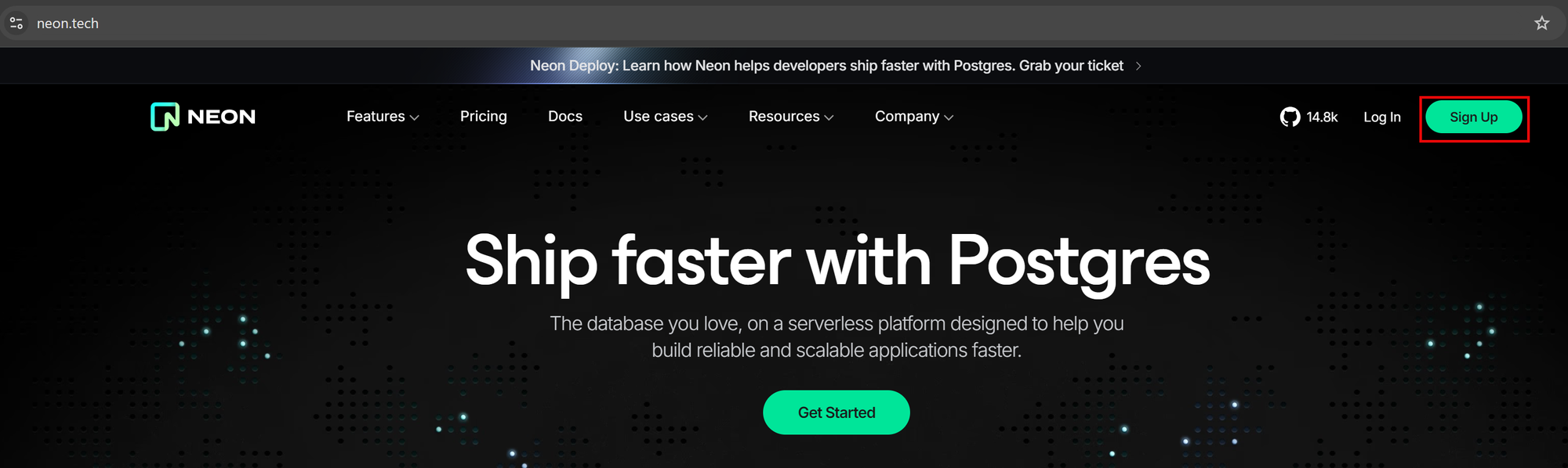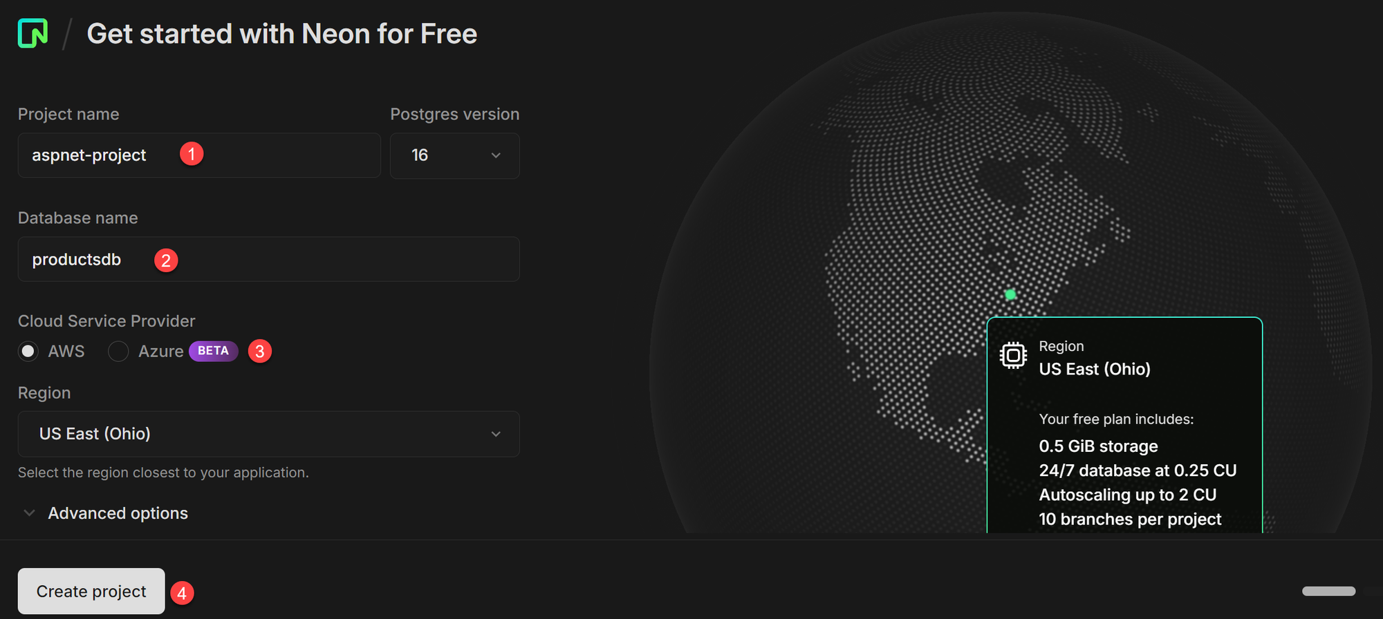 Sign up on Neon.tech and create a new project called aspnet-project (or your preferred name) and a database (with your preferred name).