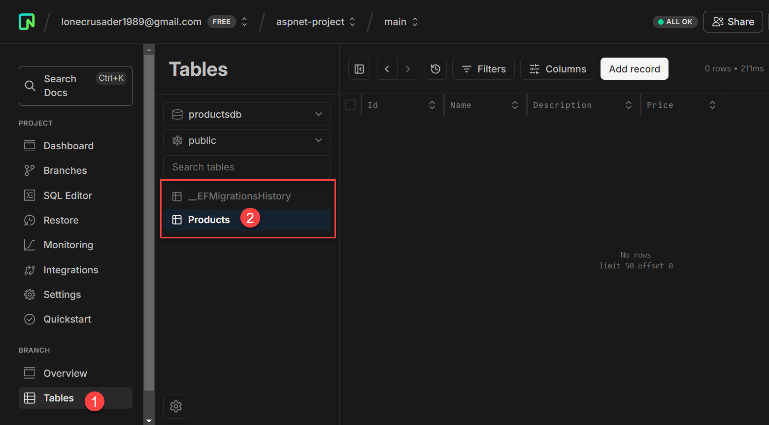 Entity Framework will create a migration that defines the structure of the Products table and apply it to the Neon PostgreSQL database. You can confirm that this table is created by visiting the Tables option in the side nav.