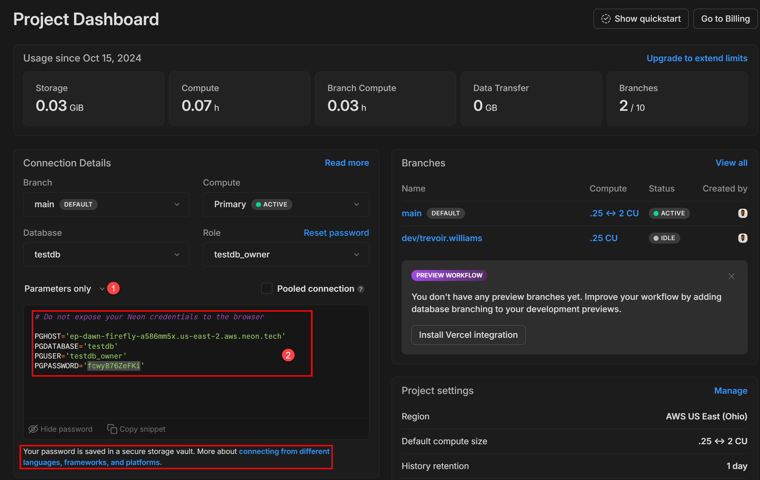 Navigate to the Project Dashboard and note down the connection credentials (Host, Database, User, Password, Port) for your PostgreSQL instance. We’ll need these to connect our ASP.NET Core application to Neon.